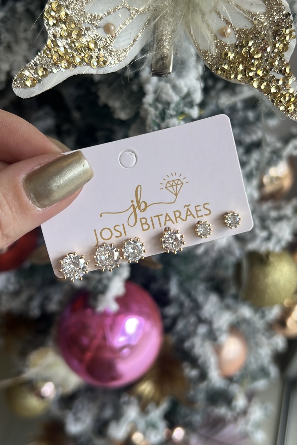Detalhes do produto: - Modelo: Trio de brincos - Banho: Ouro 18k - Peso: 5 gramas - Material: Metal com zircônias